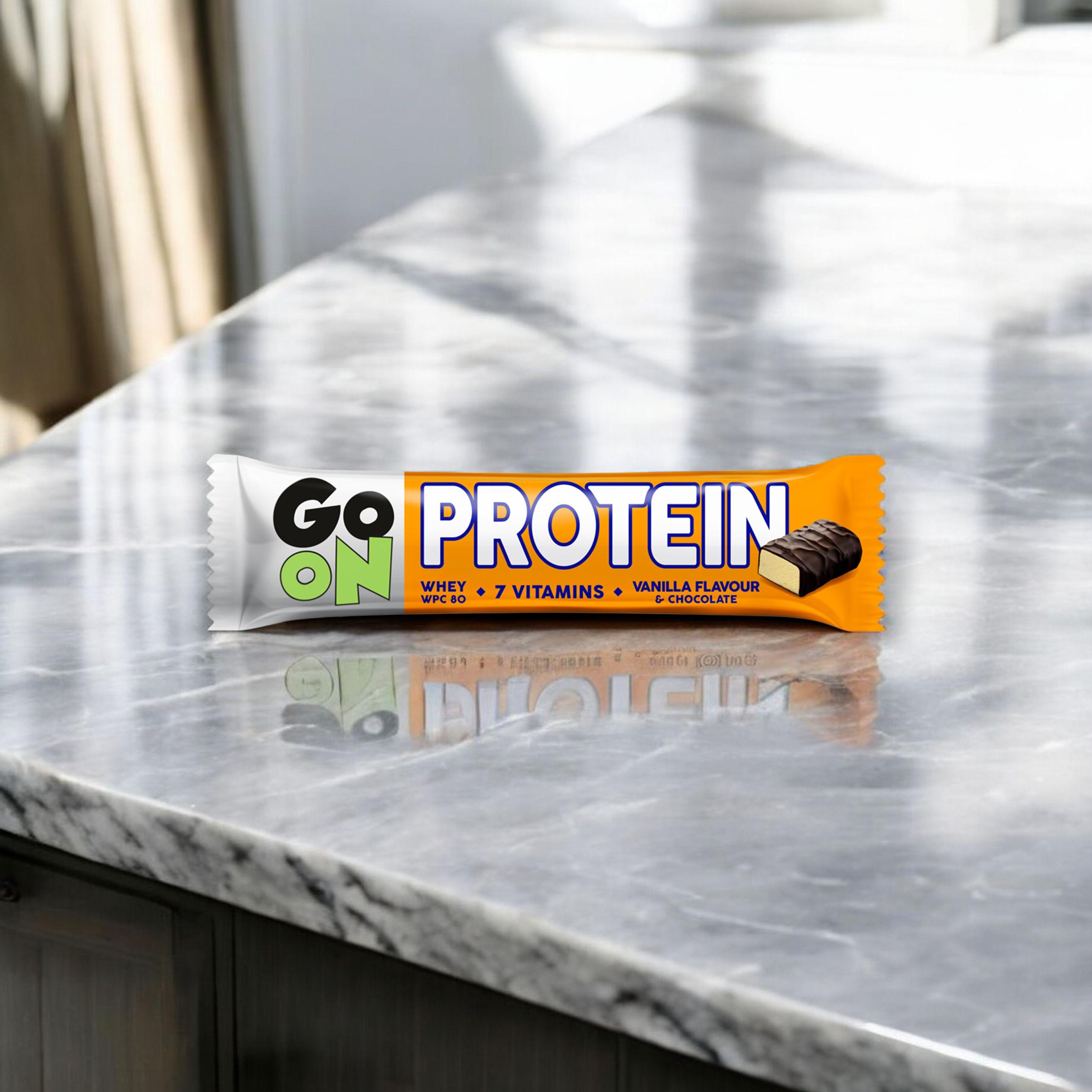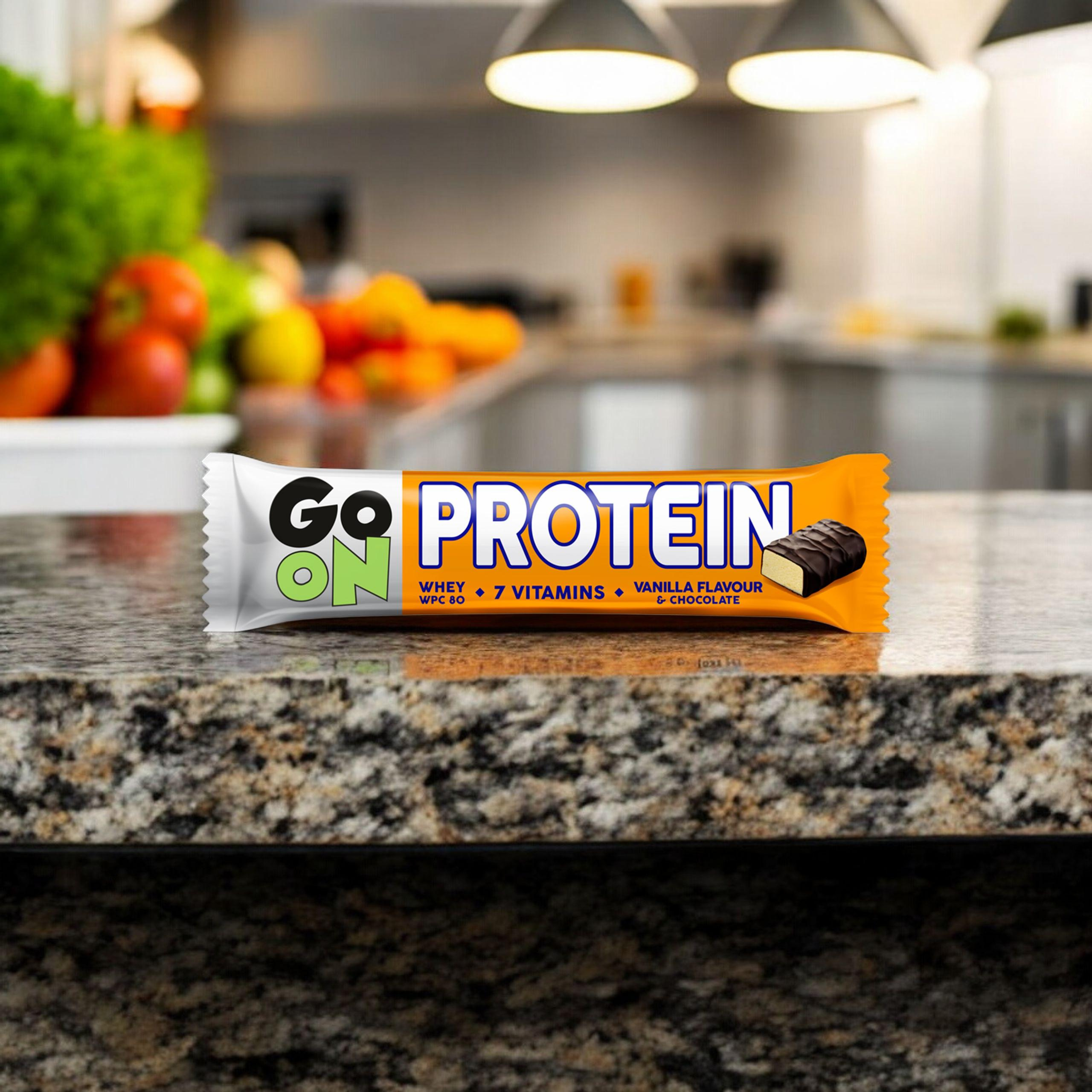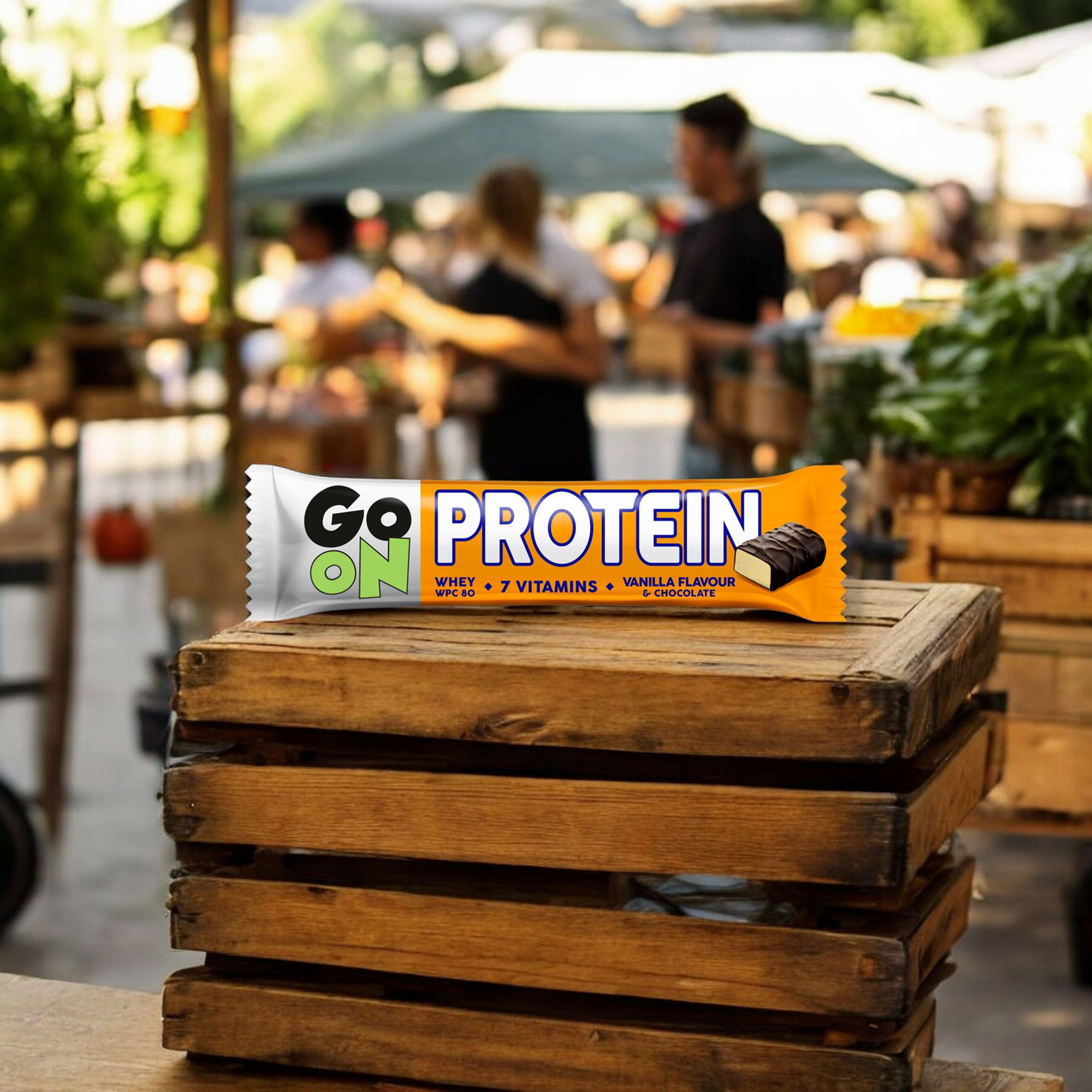- Tyčinky GO ON Protein Bar jsou produktem, jaký na českém trhu ještě nebyl! Produkt vytvořený speciálně pro fyzicky aktivní lidi, který kromě cenného pro organismus proteinu (WPC 80) obsahuje vitamíny, minerální látky a přírodní prebio...