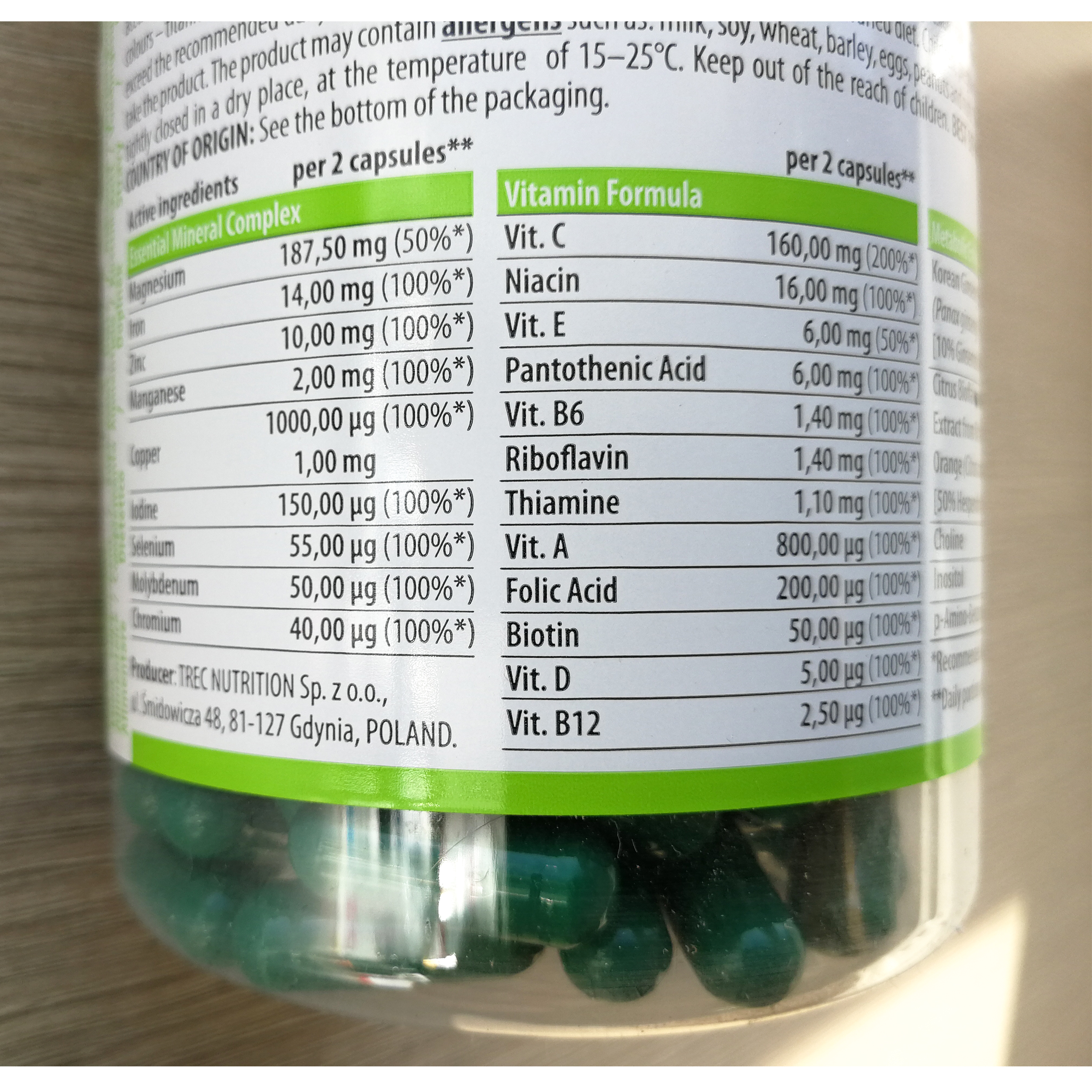 Složky: Essential Mineral Complex [oxidy a uhličitany magnézia; fumarát železa; maltodextrin; síran zinečnatý; síran manganatý; síran měďnatý; jodid draselný; chlorid chromu; molybdenan sodný; selenan sodný]; Metabolic Enhancers [extrakt z ženšenu korejského (Panax ginseng) [10% ginsenosidů]; extrakt bioflavonoidů z citrusů (Citrus aurantium) [50% hesperidinu]; bitartrát choline; inositol; kyselina P-aminobenzoová (PABA)]; Vitamin Formula [vit. C (kyselina askorbová); niacin (nikotinamid); vit. E (DL-alfa-tokoferol); kyselina pantothenová (D-pantothenát vápenatý); vit. B6 (pyridoxin hydrochlorid); vit. B2 (riboflavin); vit. B1 (mononitrát thiaminu); vit. A (retinyl acetát); kyselina listová (pteroilmonoglutamová kyselina); biotin (D-biotin); vit. B12 (kyanokobalamin); obal tobolky (želatina; barviva - oxid titaničitý, oxidy a hydroxidy železa, brilantní modř V); protispékavá látka - soli magnéziových mastných kyselin.