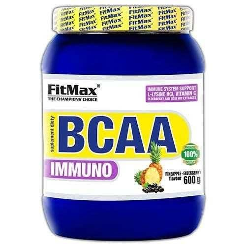FitMax® BCAA Immuno, je potravina doplňující stravu s aminokyselinami s rozvětvenými řetězci (BCAA) – L-leucin, L-isoleucin a L-valin; L-lysin, extrakty z černého bezu a šípků a vitamín C. Produkt je určen pro fyzicky aktivní osoby a sportovce.