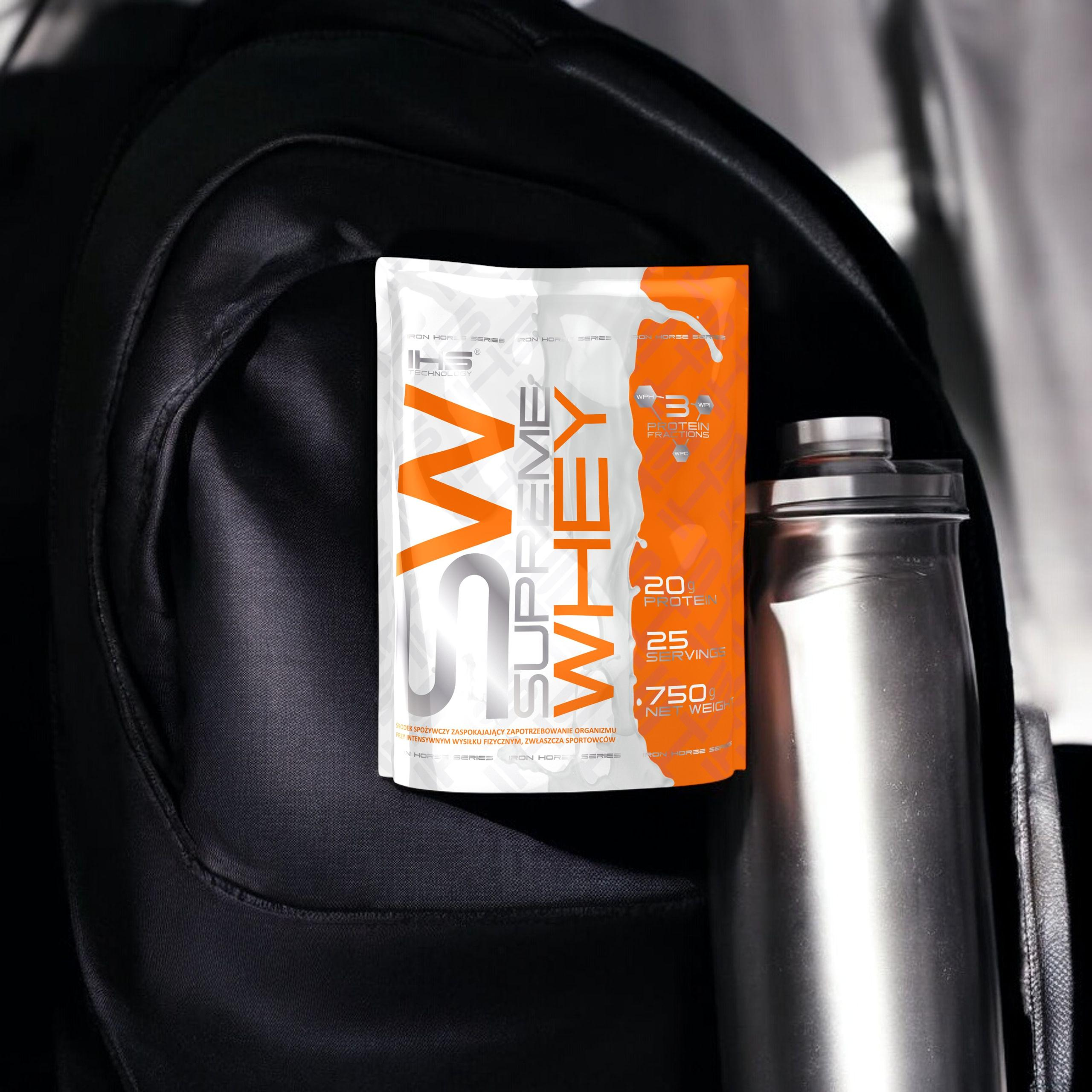 Supreme Whey je bílkovinný doplněk s velmi bohatým profilem aminokyselin, díky kterému dochází k zesílené syntéze bílkovin a zároveň k dosažení vysokého anabolického stavu těla, prostřednictvím udržování pozitivní dusíkové bilance. Díky těmto vlastnostem jsou svalové buňky neustále ve vysokém anabolickém stavu, což umožňuje jejich růst, zlepšení síly a zároveň vytrvalosti. Je to určitě jeden z nejlepších doplňků na trhu, protože obsažené rozvětvené aminokyseliny (BCAA) umožňují snadnější obnovu poškozených svalových struktur a obnovu anabolických procesů. Navíc, sada volných aminokyselin nejenže podporuje regeneraci těla, ale je také zodpovědná za obnovu energie a dobré nálady.