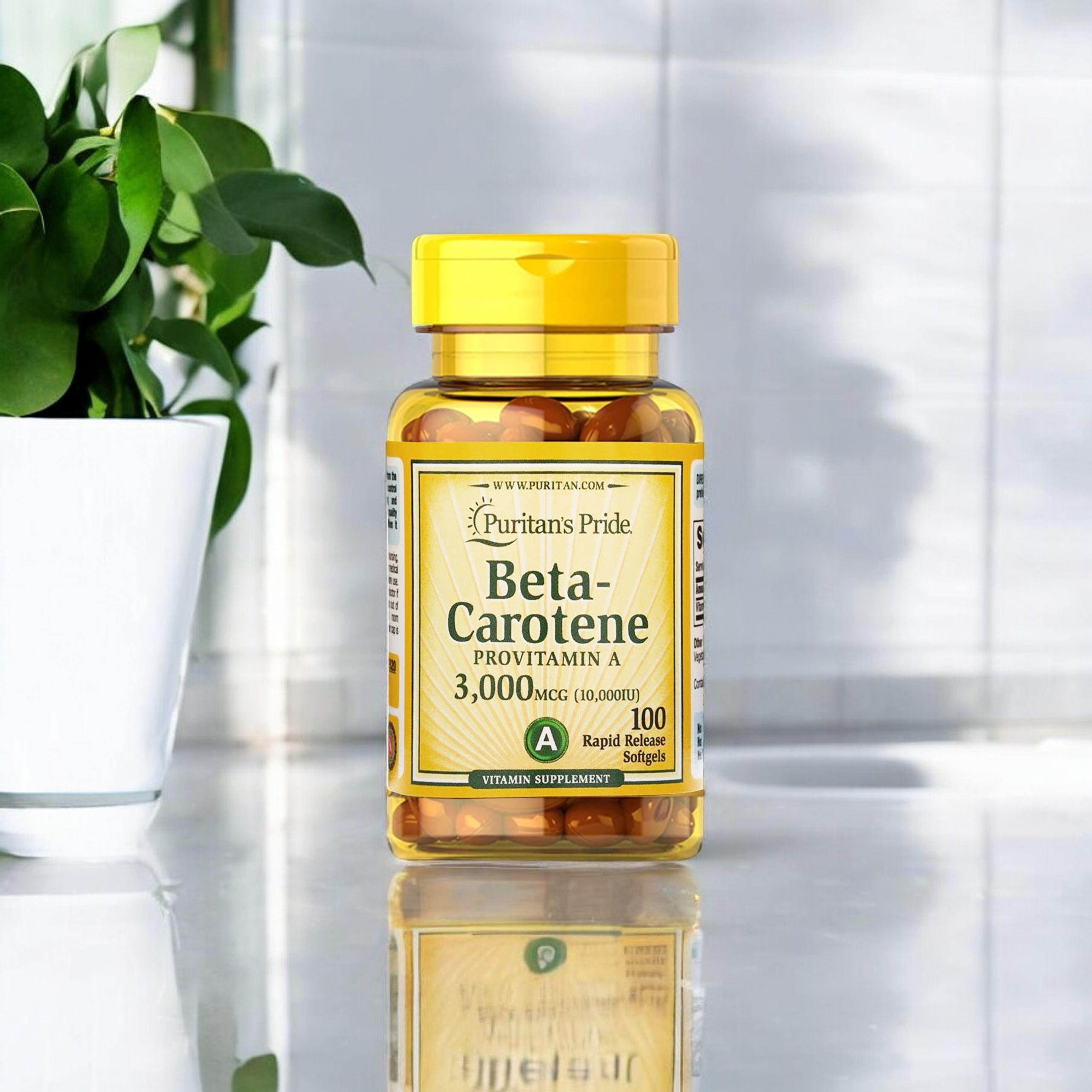 - Beta karoten od firmy Puritan's Pride to 10000 jednotek této cenné látky na porci uzavřené v měkkých želatinových kapslích. Beta karoten urychluje opalování, dává pleti pěkný odstín. V těle se přeměňuje na vitamín A.