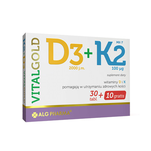 - ALG PHARMA D3 + K2 VitalGold je doplněk stravy podporující Vaše kosti, zuby a imunitu. Vitamín K2 se vyskytuje ve snadno vstřebatelné formě menachinonu (MK-7). Každá tableta dodává denní dávku vitamínů K2 a D3, poskytující komplexní podporu.