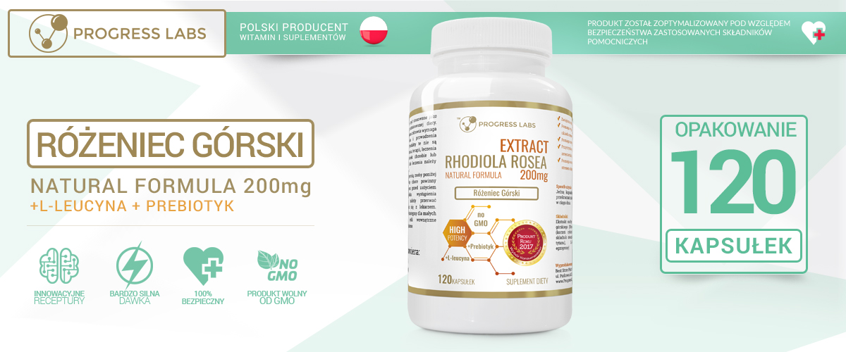 - Rhodiola Rosea Extract 200mg (3%Rosavins, 1%Salidrosides) Standaryzowany je vylepšená verze oblíbeného produktu od Progress Labs, obsahující extrakt z Rozchodnice Růžové. Nyní dostupné s přídavkem leucinu a prebiotika. Balení: 120 kapslí.