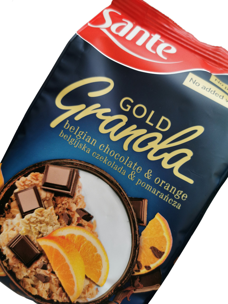 - Granola Gold od Sante jsou celozrnné, křupavé ovesné vločky, které neobsahují glukózo-fruktózový sirup ani palmový olej. Jsou zdrojem vitamínů, minerálů a vlákniny. Obohacené o lahodnou belgickou čokoládu a pomeranč.
