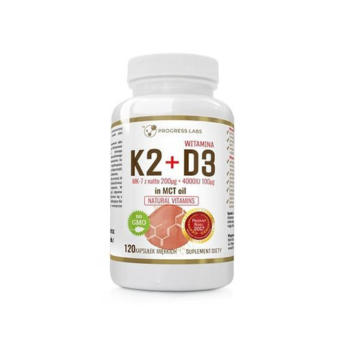 - Vitamin K2Mk-7 200mcg+D3 4000IU IN MCT je doplněk stravy od Progress Labs, který poskytuje velké dávky vitamínu K2Mk7 a D3. Oba pocházejí z přírodních zdrojů a díky své formě jsou rychle transportovány a dobře vstřebávány