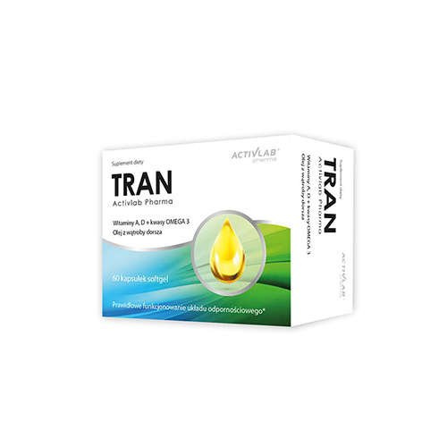 • ActivLab Tran 500 mg je doplněk stravy, který obsahuje vysoce kvalitní olej z tresčích jater bohatý na přírodní vitamíny A a D a Omega-3 kyseliny (EPA a DHA). Tran zvyšuje imunitu, ovlivňuje zdravý zrak a silné kosti.