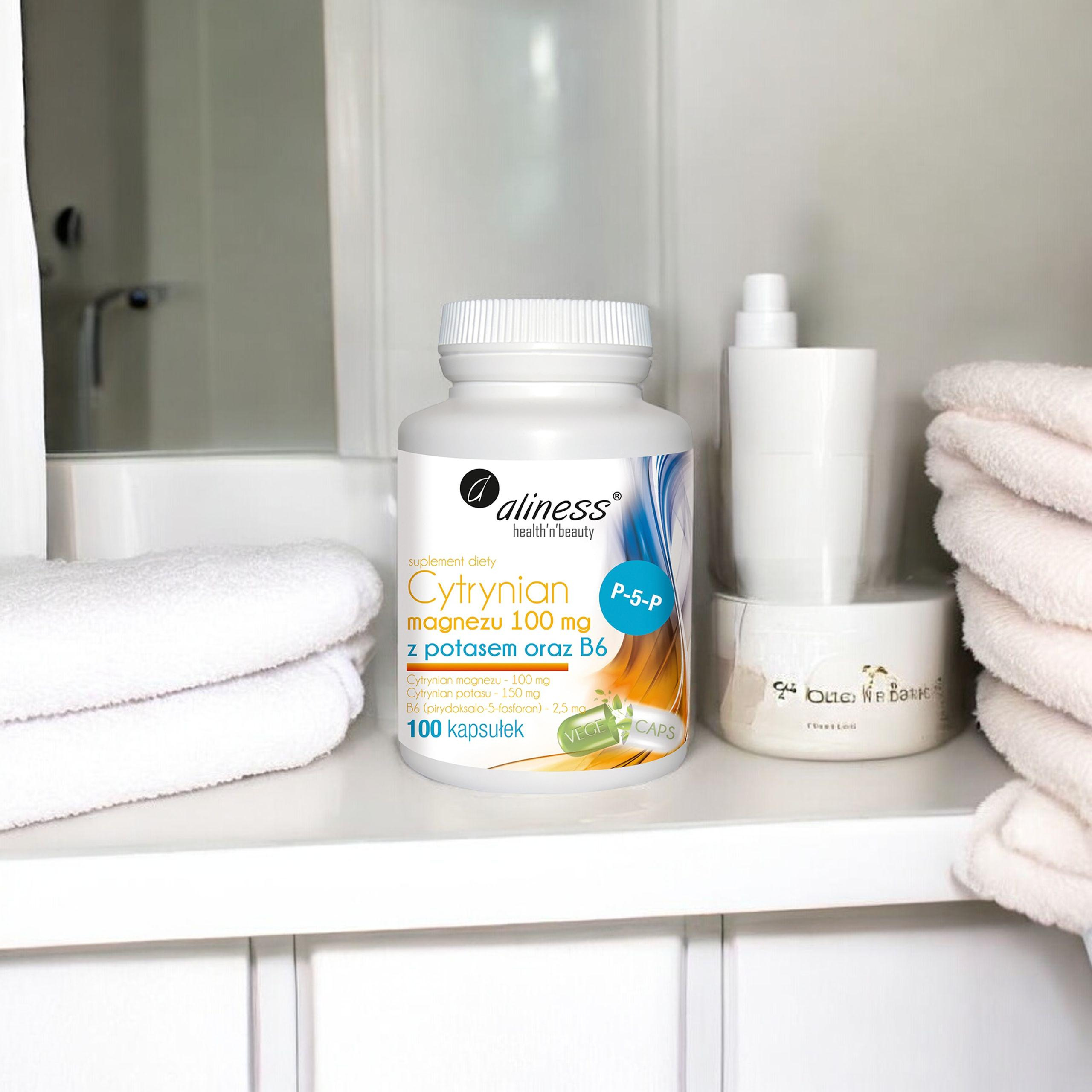 Hořčíkové doplňky stravy jsou často obohaceny vitamínem B6, z velmi dobrého důvodu. Tento vitamín zvyšuje vstřebávání hořčíku z trávicího traktu až o 20-40%, usnadňuje jeho transport mezi buňkami a pomáhá udržovat rezervy na odpovídající úrovni. Vysoká dávka aktivní formy B6 (P-5-P) obsažená v kapslích od Aliness dále pomáhá mj. regulovat hormonální rovnováhu a zajišťuje správné trávení bílkovin. Dále reguluje metabolismus glykogenu, zajišťuje efektivní fungování svalů. Na zásoby glykogenu v buňkách těla působí také draslík, který kromě toho reguluje krevní tlak a podporuje nervový systém. Složky Cytrynianu Magnezu působí synchronně, zajišťují vysokou vstřebatelnost vhodně vyvážených dávek složek, které vaše tělo potřebuje!