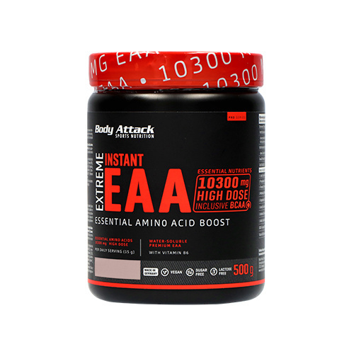 - Extreme Instant EAA od Body Attack je esenciální aminokyseliny EAA ve formě ultra jemného prášku, který se výborně rozpouští a rychle vstřebává. Účinná ochrana pro Vaše svaly.