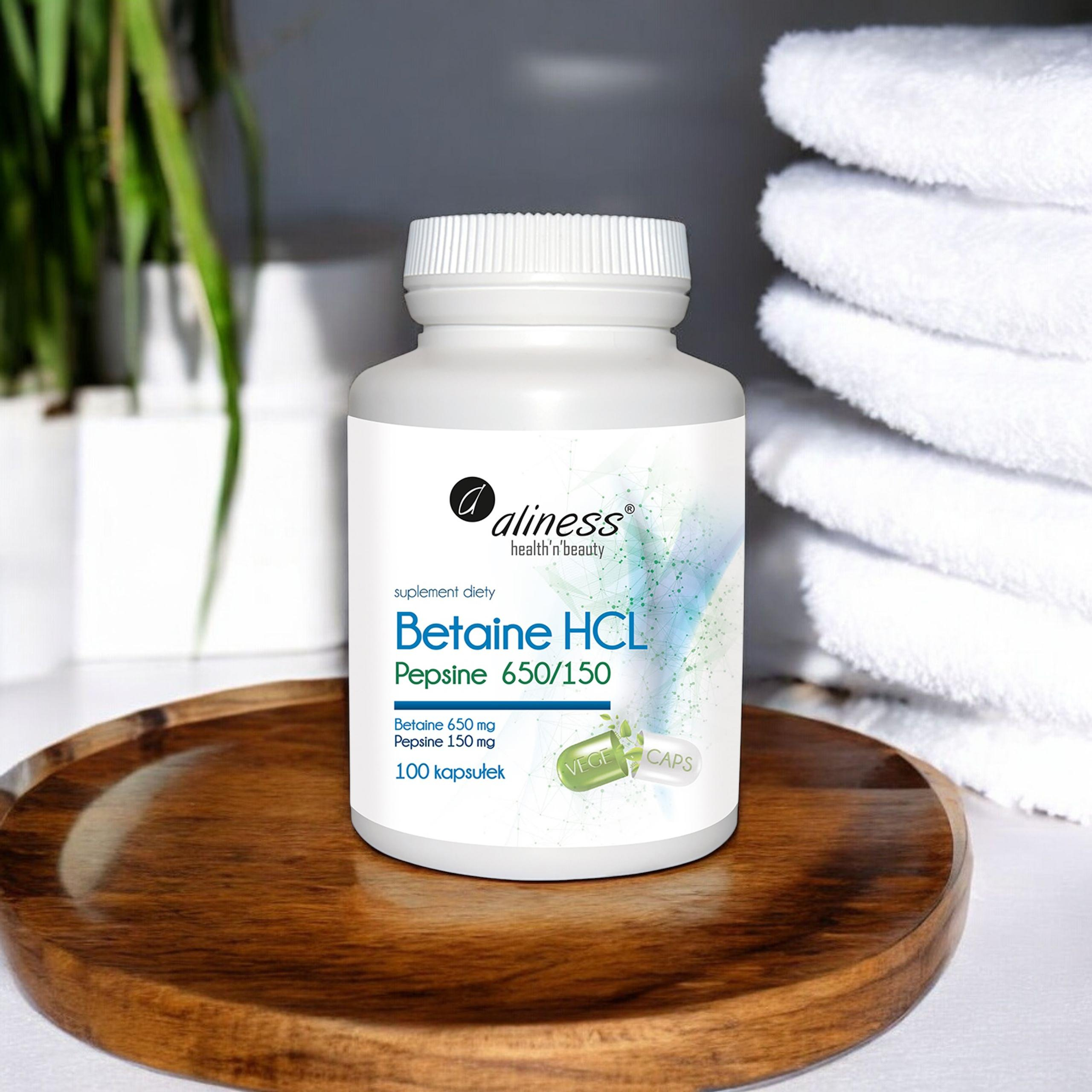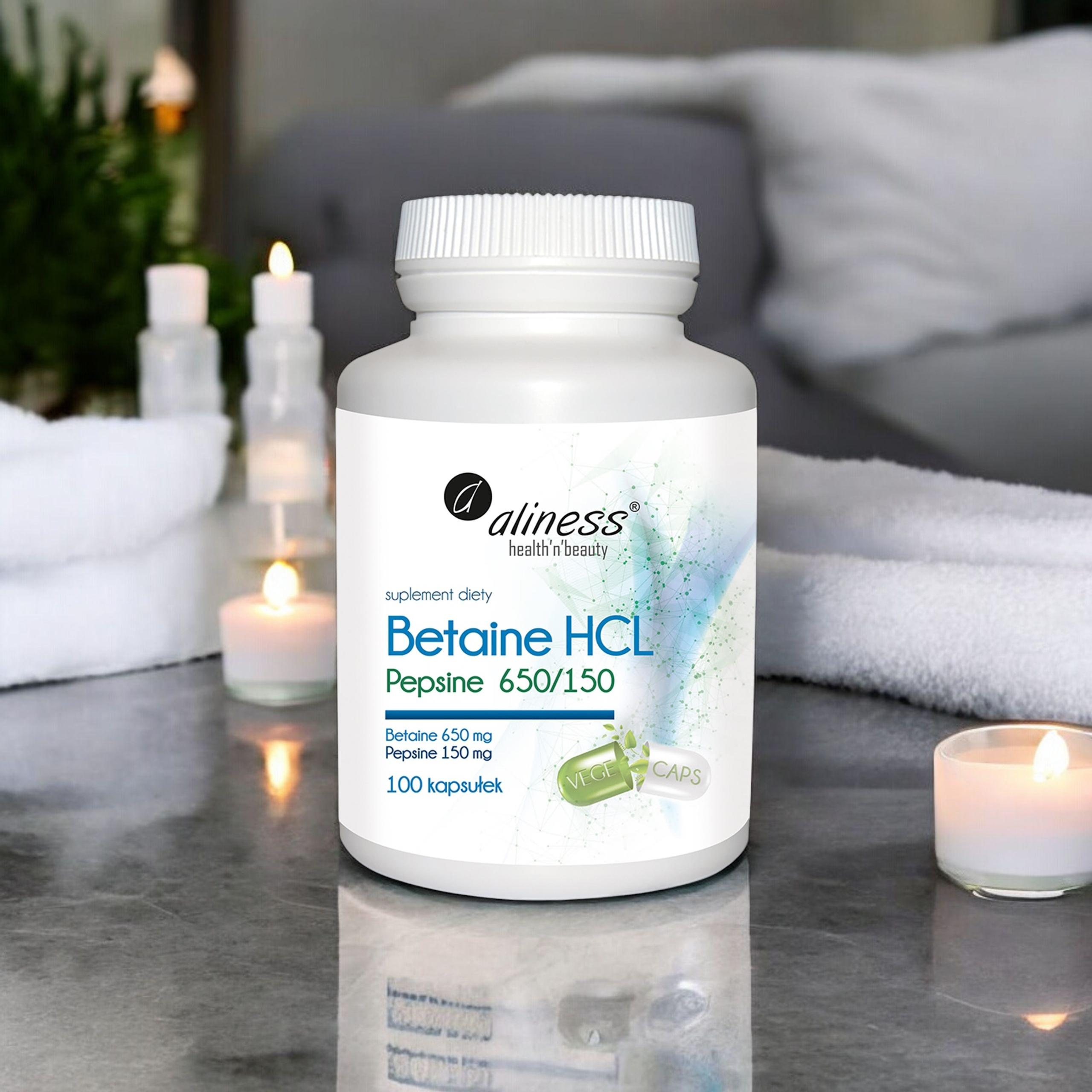 Betaine HCL Pepsine 650/150 od ALINESS je pokročilý doplněk stravy, který kombinuje sílu 650 mg chloridu betainu a 150 mg pepsinu v každé kapsli. Tento unikátní vzorec byl vytvořen, aby podporoval trávicí procesy a metabolismus, nabízející přirozené řešení pro osoby hledající zlepšení fungování trávicího traktu.