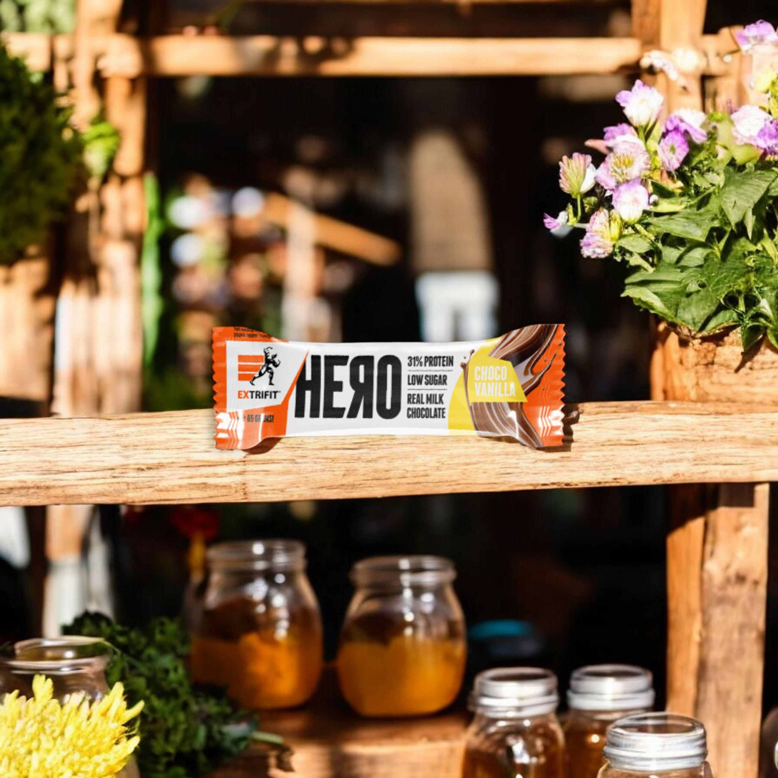 • Proteinová tyčinka Hero od Extrifit: 20g bílkovin, žádný přidaný cukr a pravá mléčná čokoláda. Ideální svačina pro aktivní lidi, podporující budování svalů a kontrolu hmotnosti.