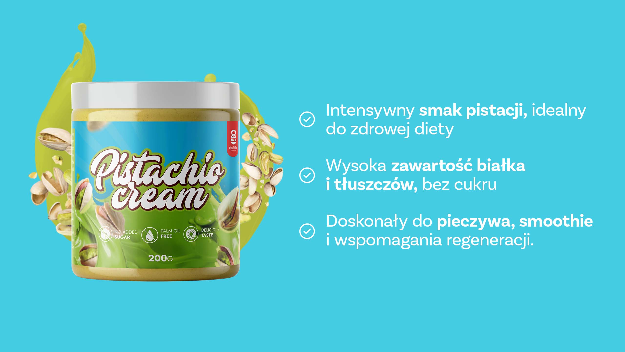 - Cheat Meal Pistachio Cream nabízí intenzivní chuť pistácií bez přidaného cukru. Vynikající jako pomazánka, do smoothie nebo dezertů, podporuje regeneraci a dodává energii, ideální pro aktivní a zdraví dbalé jedince.