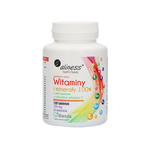 Produkt Aliness Vitamíny a Minerály 100% doporučujeme používat pro předcházení nedostatkům cenných výživových složek v každodenní stravě, v každém ročním období. Název není náhodný – jedna tableta přípravku pokrývá 100% denní potřeby organismu na vitamíny a mikro- a makroelementy. Doplňky stravy Aliness jsou vyráběny v souladu s ideou „ čisté etikety “ a proto ve složení nenajdeme alergeny, konzervanty a jiné zbytečné přídavky. Set vitamínů se vyznačuje obsahem přírodní vitamínu C a dodatečnou přítomností ženšenu. Díky tomu tablety Vitamíny a Minerály 100%imunitu, efektivně bojují s únavou a pomáhají udržet psychickou a fyzickou zdatnost. Firma ví, co dělá, proto vytvořila přípravek na míru Vašim potřebám. Vysokou kvalitu potvrzují patentované standardy výroby a certifikáty. Protože Aliness ví, že zdraví a bezpečnost jsou nejdůležitější!